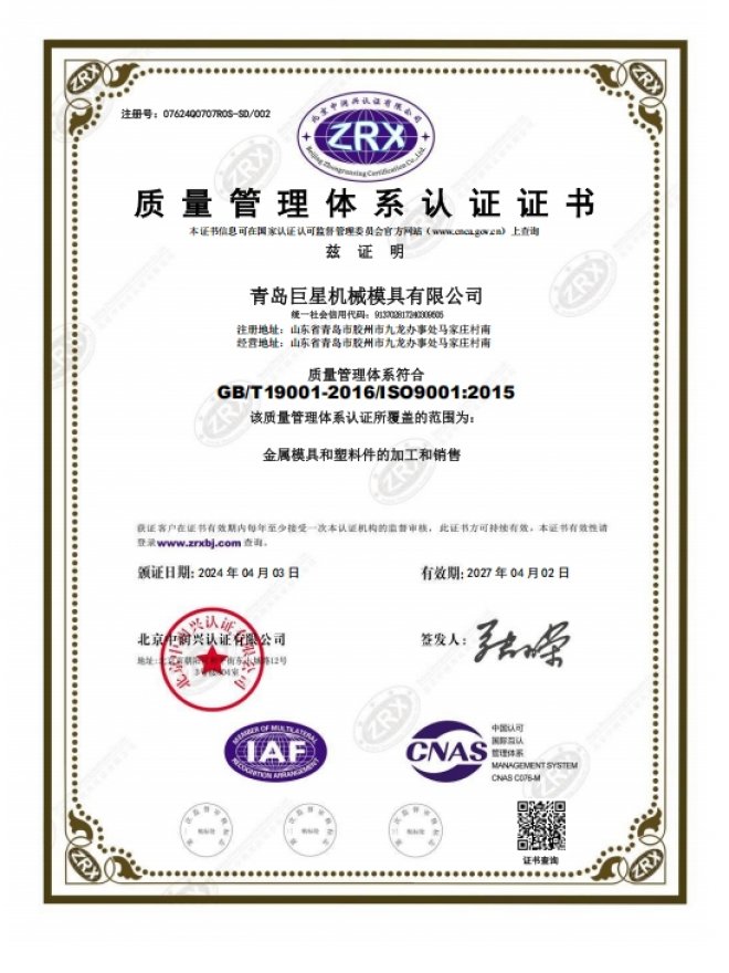 青岛巨星机械模具有限公司位于美丽的胶州湾畔——青岛市胶州市。成立于1995年。多年来一直致力于塑料模具,金属冲压模具,橡/硅胶模具,板片材挤出模具等模具的研发制造,并且配有塑料制品标准化生产车间,90T-800T各型号注塑机齐全,可为您提供模具研发与产品生产一站式服务,本司已通过ISO9001质量管理、ISO14001环境管理、ISO45001职业健康安全管理等体系认证。目前已与美国通用汽车,韩国大宇造船、现代重工,俄罗斯,巴西,非洲等国家或地区的实力公司建立长期合作关系。